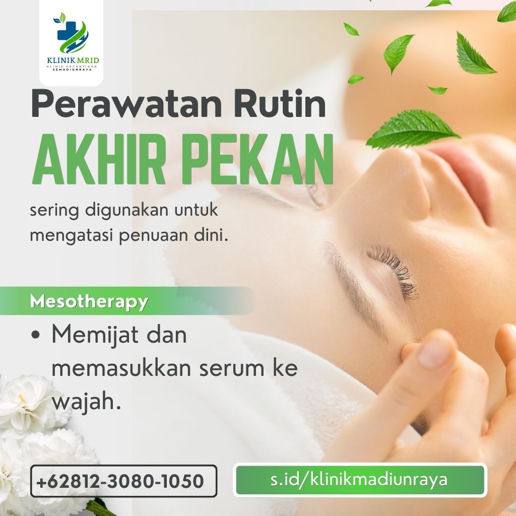 Ini adalah perawatan pijat wajah yang juga melibatkan penyuntikan serum khusus. Serum ini membantu meremajakan kulit dan meningkatkan kekenyalannya. Mesotherapy sering digunakan untuk mengatasi penuaan dini.