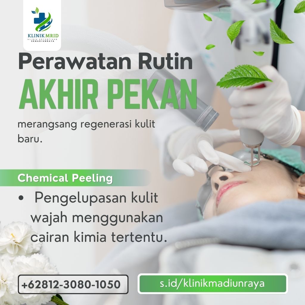 Perawatan ini melibatkan pengelupasan kulit wajah menggunakan cairan kimia tertentu. Tujuannya adalah untuk merangsang regenerasi kulit baru. Ada berbagai tingkat kekuatan chemical peeling, tergantung pada masalah kulit yang ingin diatasi.