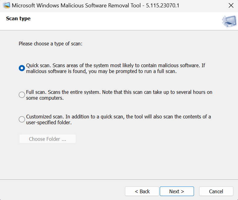 Disini nih yang terpenting, teman perlu milih nih antara Quick Scan, Full Scan, atau Customized Scan, miminkyat saranin yang Quick Scan saja biar mempercepat waktu, kemudian klik Next >